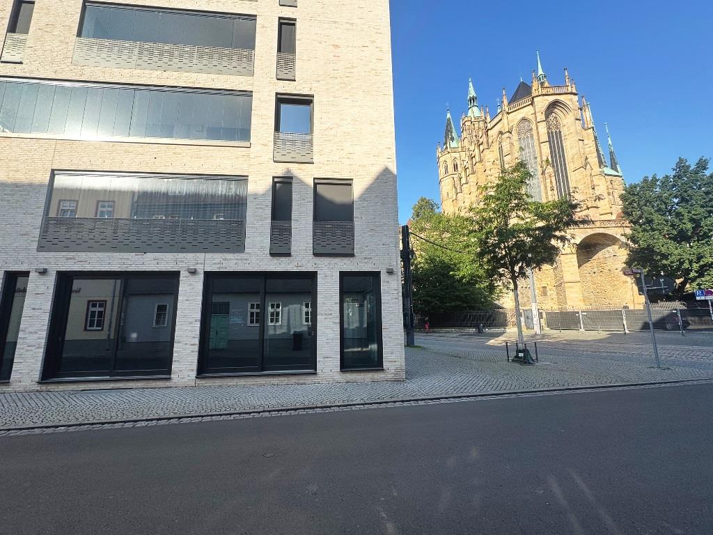 Im modernen Wohn- und Gewerbeobjekt - Baujahr 2018 - am Erfurter Domplatz stehen zwei exklusive Gewerbeflächen mit insgesamt ca. 450 m² (Einheiten á ca. 313 m² und ca. 137,50 m²) zur Nachvermietung. Die Mietflächen im Erdgeschoss vereinen in sich hochwertiges Design, großzügige Raumstrukturen und eine der begehrtesten Lagen der Stadt. Bodentiefe Fensterfronten und großflächige Schaufenster sorgen für helle Räume, maximale Sichtbarkeit und ein repräsentatives Ambiente für Ihre Kunden. Die Flächen sind barrierefrei erschlossen und flexibel nutzbar – ob als Ladengeschäft, Praxis oder Büro. Individuelle Anpassungen der Raumstruktur sind möglich.