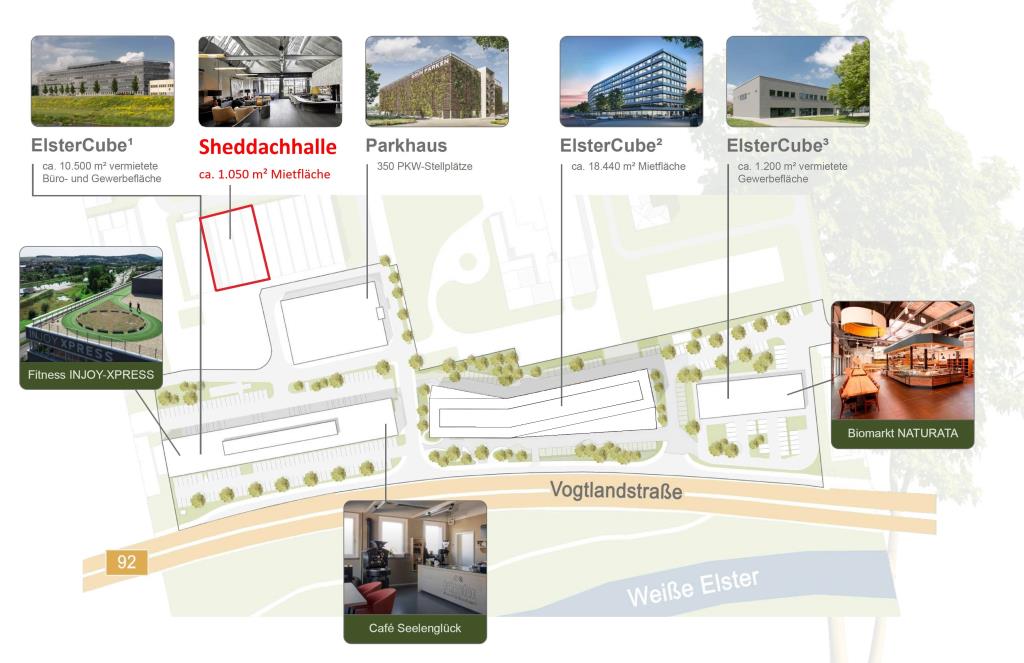 Mit der markanten Sheddachhalle auf dem ElsterCube-Areal entsteht in Gera eine außergewöhnliche Büro- und Arbeitswelt, die den Charme historischer Industriearchitektur mit den Anforderungen moderner Unternehmen verbindet. Großzügige Raumhöhen, sichtbare Tragstrukturen und die typische Sheddach-Silhouette schaffen eine einmalige Atmosphäre – ideal für kreative Arbeitswelten, Agenturen, Start-ups, New-Work-Konzepte oder anspruchsvolle Showrooms.